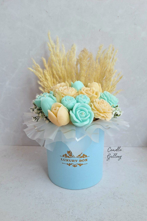 این باکس گل شمعی آبی کرمی دستساز با قطر ۱۵ سانت و ارتفاع نهایی ۳۰ تا ۳۵ سانت، ترکیبی از شمعهای پارافین درجه یک و دیزاین خلاقانه با کاغذ ضدآب، گل پامپاس و گل عروس است.