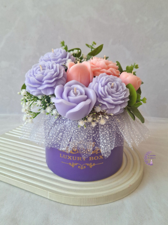 باکس گل شمعی دستساز با قطر ۱۳ سانت و ارتفاع نهایی ۲۰ تا ۲۵ سانت، ترکیبی از شمعهای پارافین درجه یک و گلهای تزئینی است که با تور و برگهای طبیعی یا مصنوعی دیزاین شدهاند.