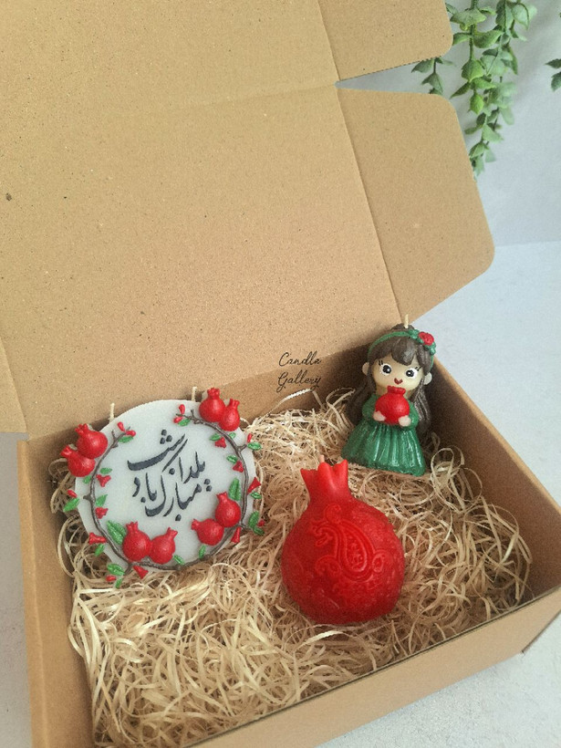 این پک شامل یک عدد شمع دخترک انار به دست و یک عدد شمع کتیبهای طرح شب یلدا و یک عدد شمع انار میباشد