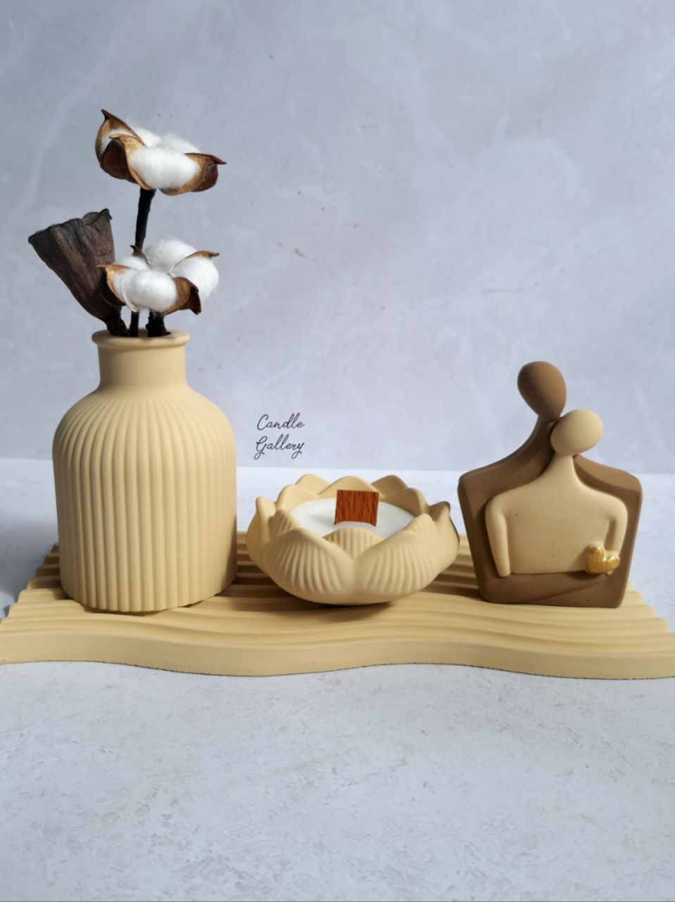این ست شامل یک عدد سینی طرح موج، یک عدد گلدان طرح مراکشی به همراه گلهای پنبه و پسته مطابق عکس، یک عدد شمع ظرفی به شکل گل نیلوفر و یک عدد مجسمه به شکل زوج همگی از جنس بتن محکم و بادوام و به رنگ کرمی میباشد.
