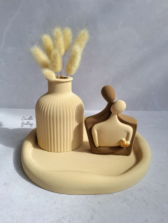 این ست شامل یک عدد سینی گرد دفرمه،یک عدد گلدان طرح مراکشی به همراه گلهای دم خرگوشی مطابق عکس و یک عدد مجسمه زوج عاشق میباشد که همگی به رنگ کرمی و از جنس بتن محکم و بادوام هستند